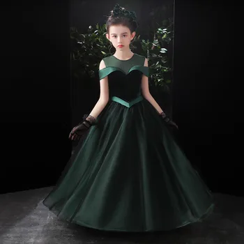 שמלת ערב לילדות בצבע ירוק זית בעיצוב מיוחד מהאגדות, שילוב של קטיפה, כותנה וסטין, אורך רצפה ללא שרוולים