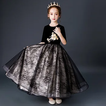 שמלת ערב לילדות שחורה עם קרמה מהממת מקטיפה, אלגנטי לאירועים נוצצים, שרוול 3/4, רוכסן אחורי