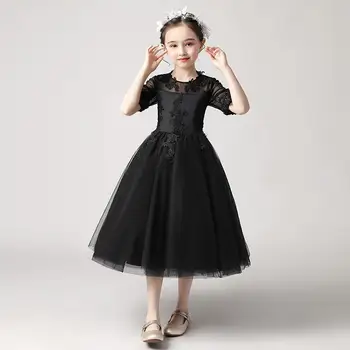 שמלת נסיכה שחורה לילדות, עם טול 3 שכבות, שרוול קצר ואפליקציות מדהימות משולבות בתחרה ורשת, אלגנטית באיכות גבוה