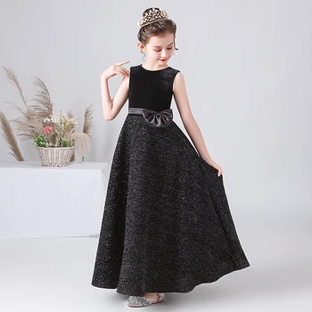 שמלת פאאטים שחורה לילדות ארוכה מקטיפה עם פפיון מלפנים, ללא שרוולים, נוצצת במיוחד