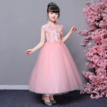 שמלת שושבינה לילדות בסגנון סיני, צווארון רשת עם רקמת תחרה מהממת ואפליקציות פרחים שזורות פנינים עבודת יד