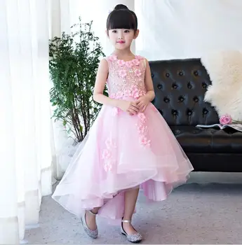 שמלת שושבינה לילדות עם רקמה פרחונית ומשובצת פנינים בצבע ורוד ללא שרוולים, פפיון קשירה אחורי, מדהימה