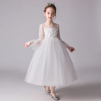 שמלת שושבינה לבנה מושקעת לילדות עם רקמה, תחרה ופנינים שזורים בעיצוב מושלם, שרוול ארוך שמלת נצנצים