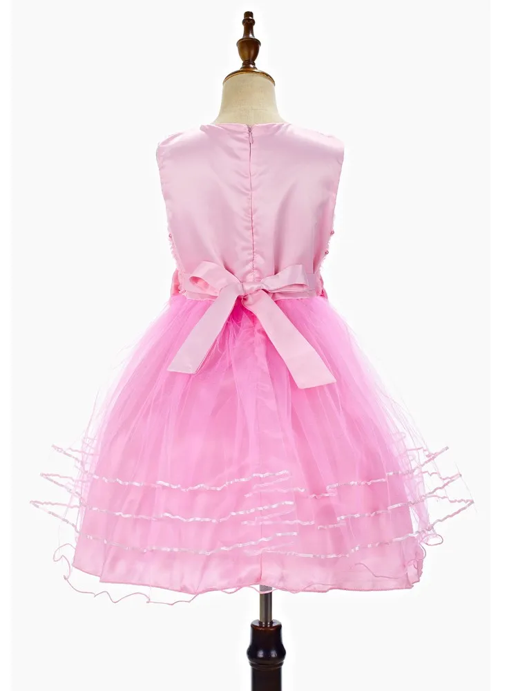 שמלת שושבינה לפעוטות ללא שרוולים, תחרה ואפליקציות מטריפות, נפוחה ללא צורך בטול מנפח, וסרט ארוך לקשירה חופשית מאחור ומלא נצנצים