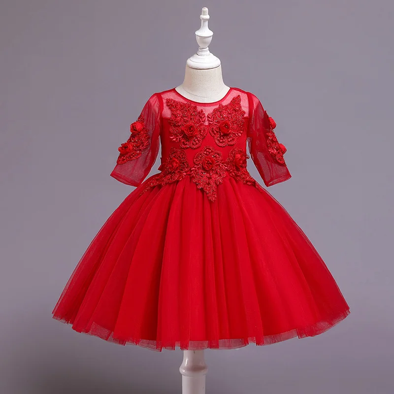 שמלת ברך תחרה פרחונית לילדות עם שרוולים ארוכים ופרחים עדינים בצבע קרם