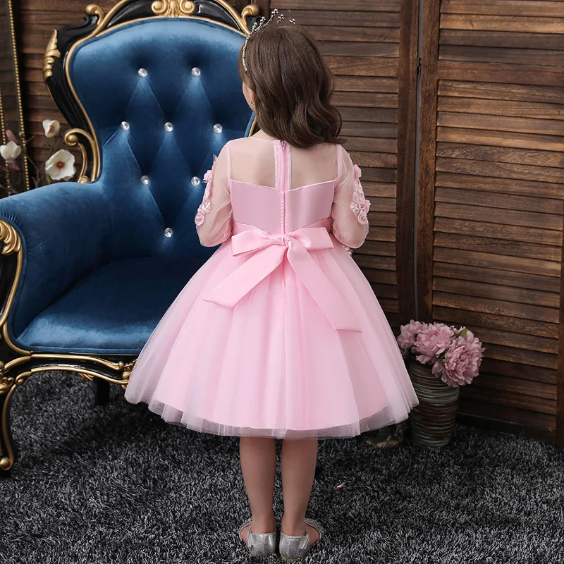 שמלת שושבינה נפוחה בצבע ורוד, עם תחרה, אפליקציות ואבנים משובצות בעבודת יד, שרוול ארוך, גובה קרסול - מידות שנה עד 14