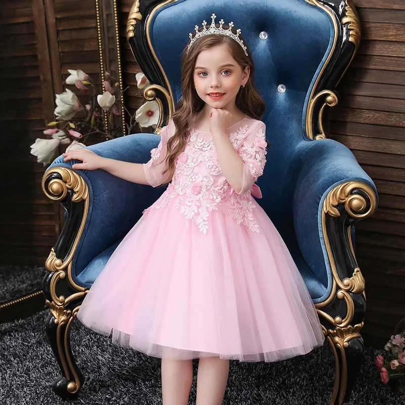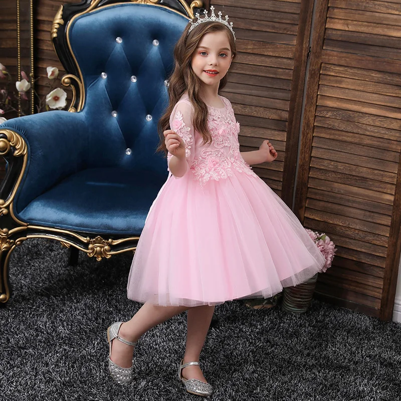 שמלת ברך לילדות עם פרחים, פנינים ותחרה בשילוב מיוחד, ללא שרוולים בצבעים ורוד, לבן ותכלת