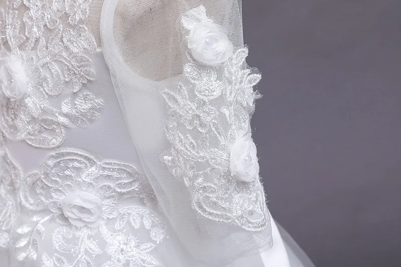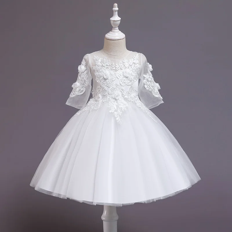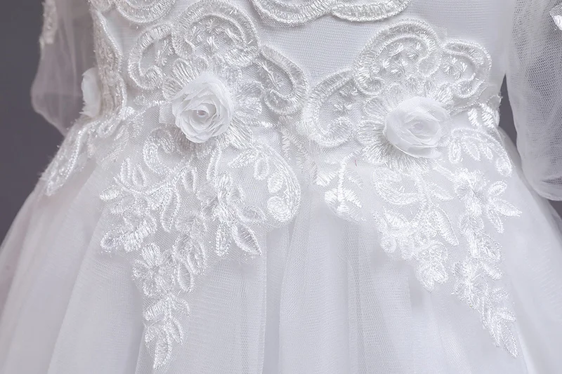 שמלת שושבינה לבנה מאלפת לילדות, שרוול ארוך עם אפליקציות ונצנצים, אורך ברך או קרסול