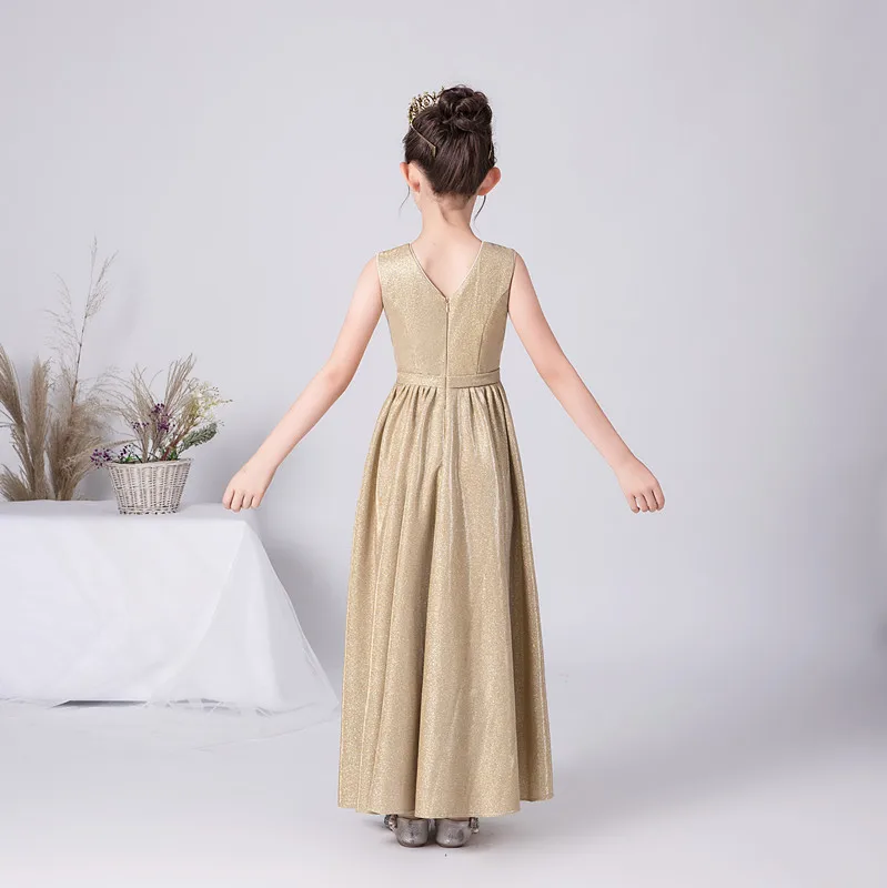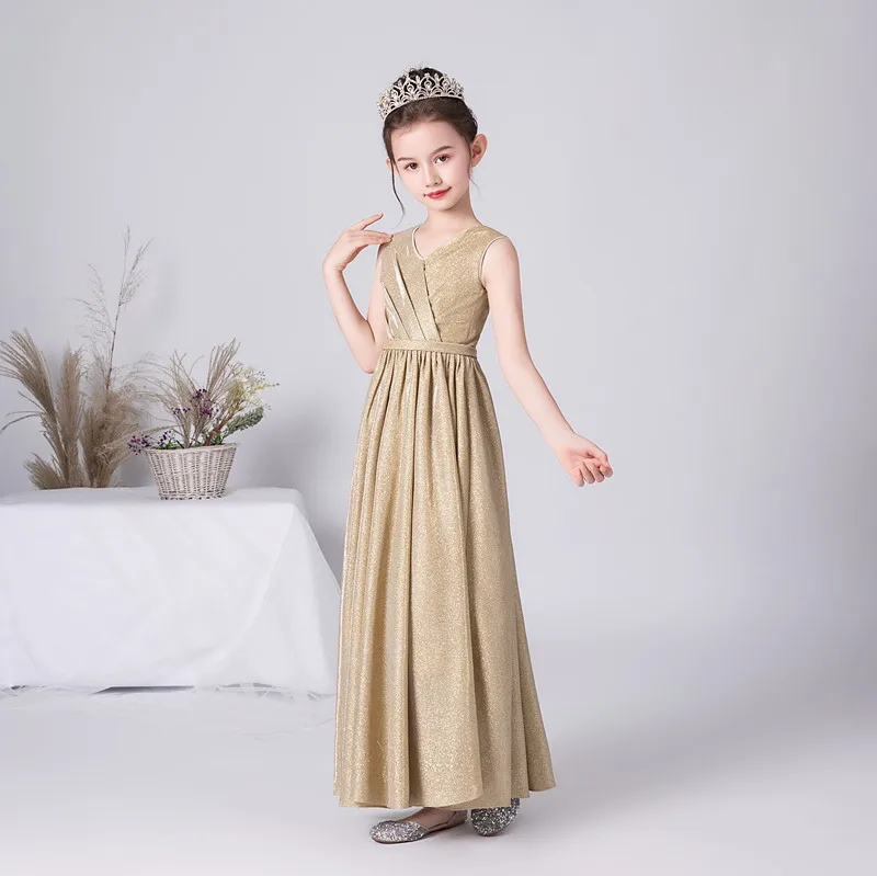 מק"ט: 1005001572686263שמלת שושבינה לילדות בצבע זהב, בעיצוב מעטפת קפלים אורך קרסול – מהממת ואיכותית